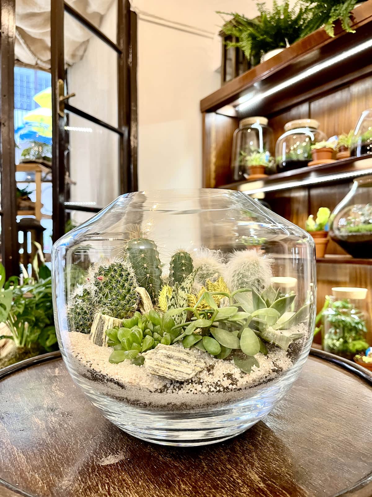 Otvorené terárium obsahuje sukulenty a kaktusy. Nádoba ja sklenená.